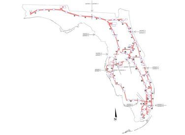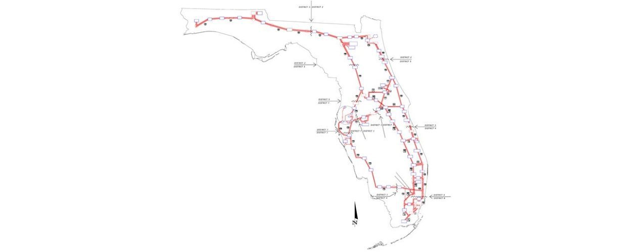 Halff assisted in coordinating with each FDOT District and various local municipalities across the state to obtain dedicated fiber reservations and identify delineation points for splicing or patching the chord configurations necessary to deliver the network across district lines. A significant amount of detailed documentation was required to certify project success due to the substantial size of the network and a large number of stakeholders and fiber owners. New fiber optic cable laterals were designed to complete links between district-owned fiber backbones and fiber drops into FDOT Central Office hub buildings to regenerate fiber optic signal between network nodes.